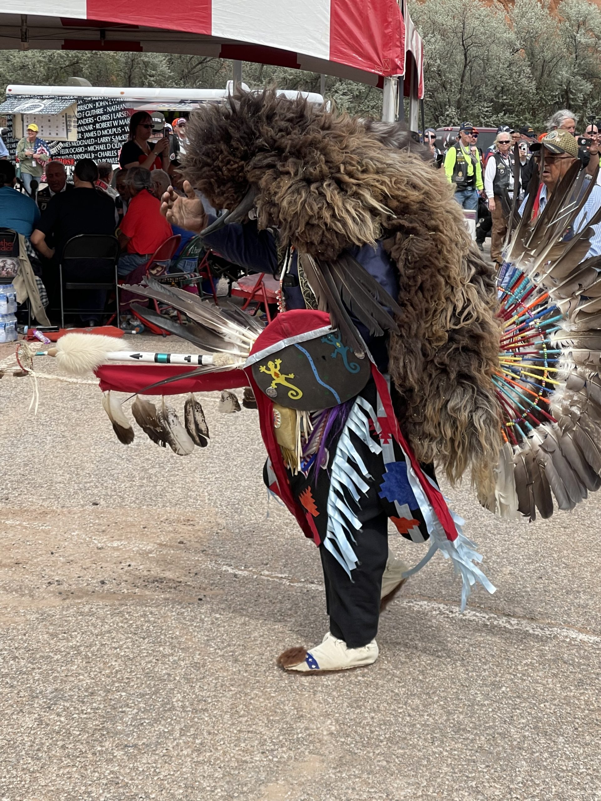 We left Holbrook bound for Gallup, NM where I greatly anticipated our time at Red Rock Park and the three mile’ish parade we ride through town. While not the throng of people we usually encounter on the parade through town, we were met with a good number of patriots who waved flags and cheered our arrival. This is significant. Gallup, NM and the Navajo people were especially impacted by COVID. To see the city rebounding and people starting to get back to a generally normal way of life is very encouraging. The culmination of our parade through town was our arrival at Red Rock Park. The street was lined was flags on both sides ushering us through the history of warriors past who sacrificed for our great nation into a ceremony of honor presented by representatives of several First Nations (Navajo, Comanche, Osage, Cheyenne, and descendants of the Modoc tribe from NE California).