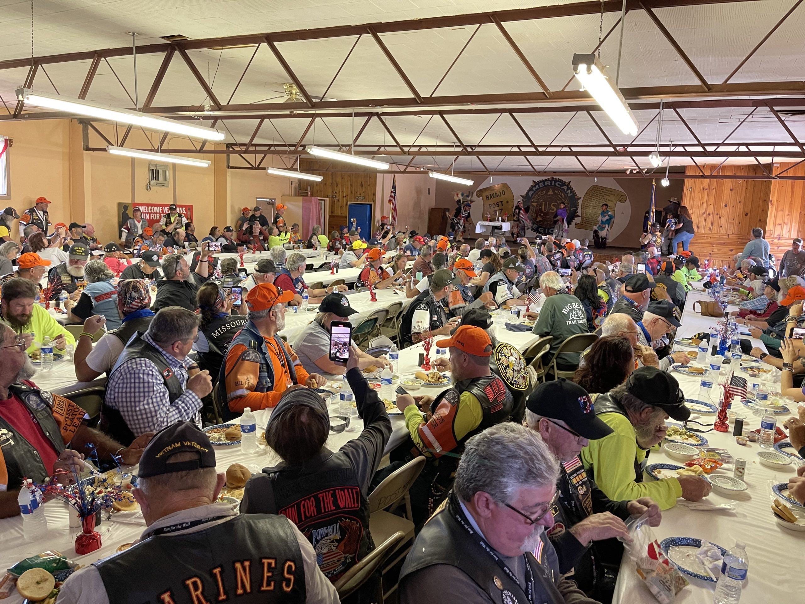 The small town of Rainelle is an incredible patriotic town. When we arrive it is fully decked out in red, white, and blue for Memorial Day and the Fire Department flies massive USA and POW/MIA flags at the peak of their ladder truck’s extension. But the town is not what, or who, we’ve come to see. All of the fundraising in the form of platoon challenges, military branch of service challenges, raffles, and auctions are to raise money for Rainelle Middle School. The school utilizes the funds we provide for field trips, computers, and anything else that can help the children but isn’t available in the local budget. This year, the riders donated a total exceeding $25,500. When we arrived, townsfolk were out waving flags as we paraded through town and then went around a block to put our 400’ish bikes in line to stop right in front of the Middle School. As we passed the kids we heard them chanting “USA! USA! USA!” over the roar of our engines. What a great sound! Once we were parked on the street in front of the school, the melee began. Throngs of children interacted with riders to obtain autographs in booklets prepared especially for today. Riders knew this was coming so they prepared by securing gifts in the form of stickers, pens, pencils, snap bracelets, frisbees, little ducks, pop sockets, and all sorts of other things to leave behind as mementos of our visit. Once all of our gifts are handed out and we finish signing booklets the school provides a lunch. Today, it was Italian-themed and held in the school cafeteria. It was great seeing riders some many decades removed from a Middle School lunchroom sitting at the tables enjoying the moment.