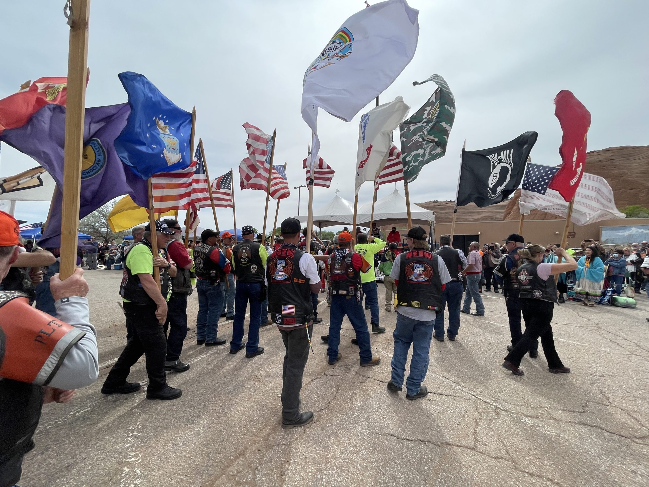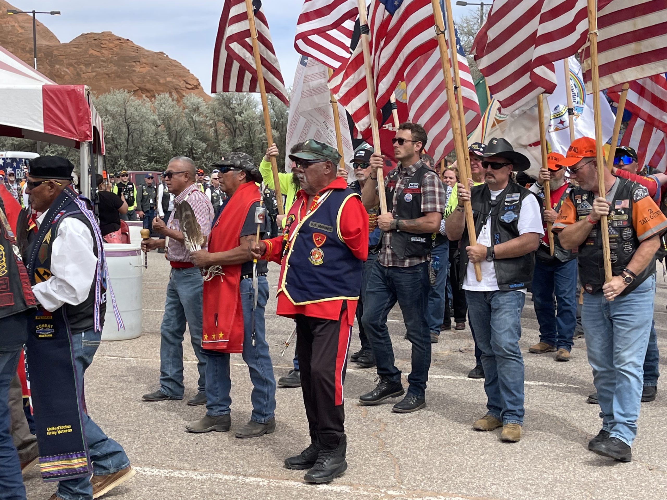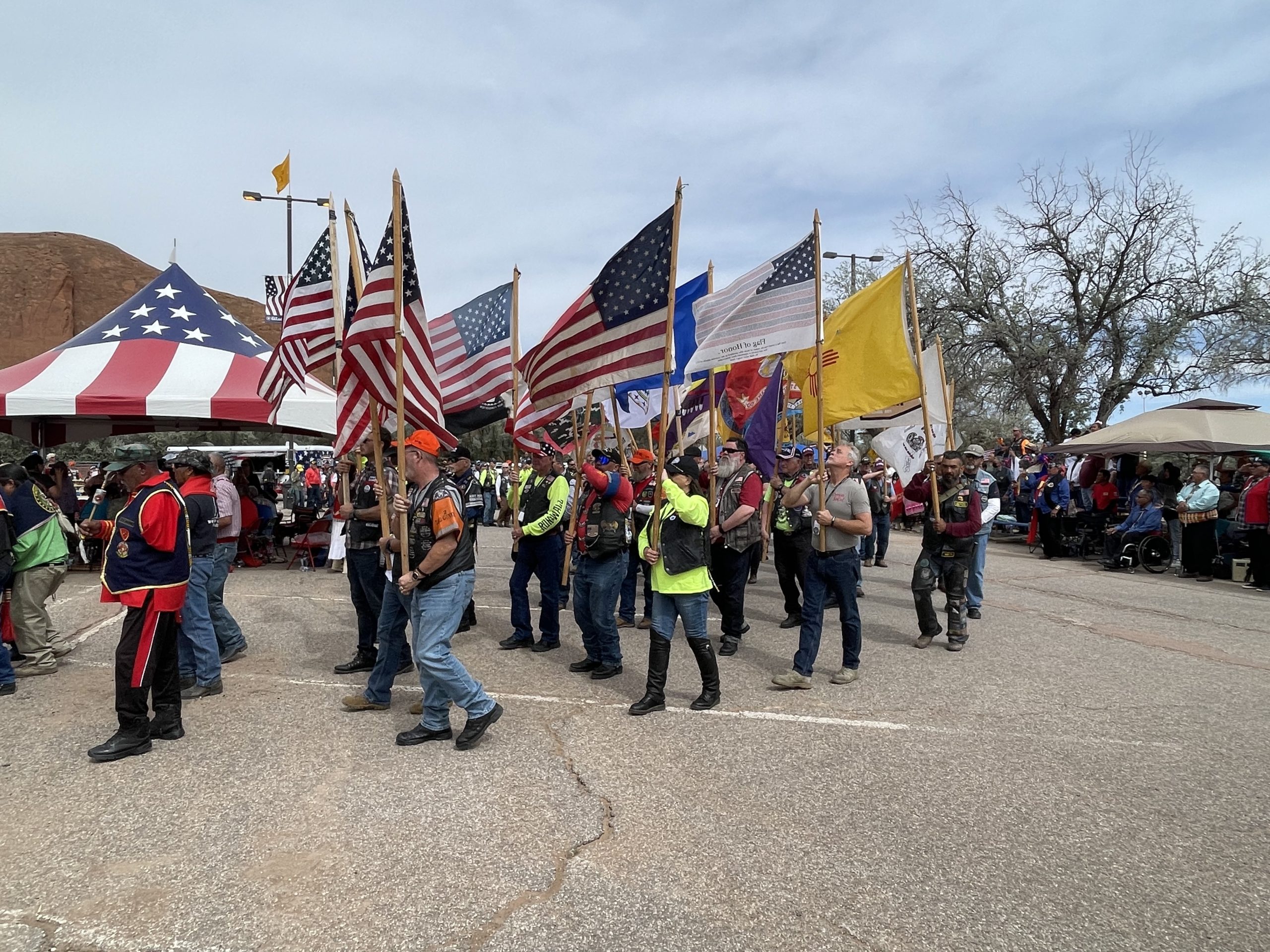 We left Holbrook bound for Gallup, NM where I greatly anticipated our time at Red Rock Park and the three mile’ish parade we ride through town. While not the throng of people we usually encounter on the parade through town, we were met with a good number of patriots who waved flags and cheered our arrival. This is significant. Gallup, NM and the Navajo people were especially impacted by COVID. To see the city rebounding and people starting to get back to a generally normal way of life is very encouraging. The culmination of our parade through town was our arrival at Red Rock Park. The street was lined was flags on both sides ushering us through the history of warriors past who sacrificed for our great nation into a ceremony of honor presented by representatives of several First Nations (Navajo, Comanche, Osage, Cheyenne, and descendants of the Modoc tribe from NE California).